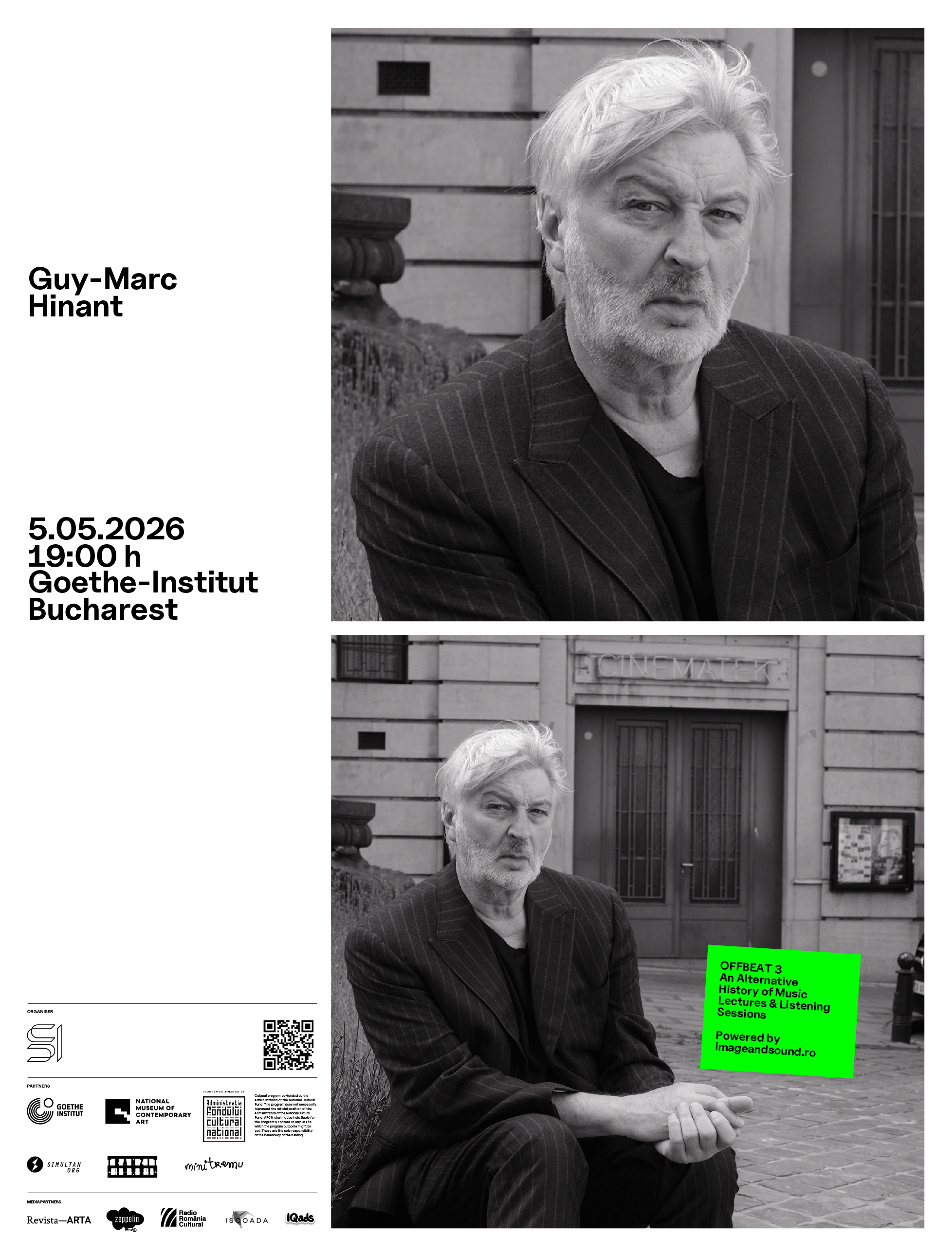 Evenimentele se vor desfășura în perioada 5 mai – 30 iunie 2026 la Goethe-Institut București. În paralel, Spațiul OFFBEAT va completa programul cu proiecții de film, audiții, prezentări de carte ori formate hibride, ce vor fi anunțate pe parcurs (primul eveniment IG / FB).