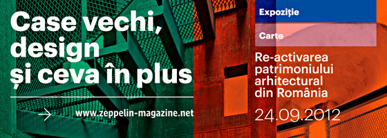 Creativitate in conditii greleSerile Zeppelin # 4220 septembrie 2012, ora 19.00Aula Magna, Biblioteca Centrala Universitara Carol I,BucurestiAm invitat pentru primul Zeppelin de dupa vacanta doua tinere birouri: ADNBA si I/O. Un birou romanesc si unul bulgar, ambele insa de succes (inclusiv international). Va fi un Zeppelin despre lucrari mari si lucrari mici si despre strategii creative pentru capitalele Europei de sud-est.- Recommend on FacebookTweet about itRe-activarea patrimoniului arhitectural din RomaniaO carte si o expozitie marca Zeppelin24 septembrie 2012, ora 19:00Biblioteca Centrala Universitara “Carol I”Zeppelin lanseaza o carte si o expozitie despre design si arhitectura ultramoderne, produse si tehnologii de ultima ora – toate aplicate pentru salvarea si re-activarea unor cladiri de patrimoniu.