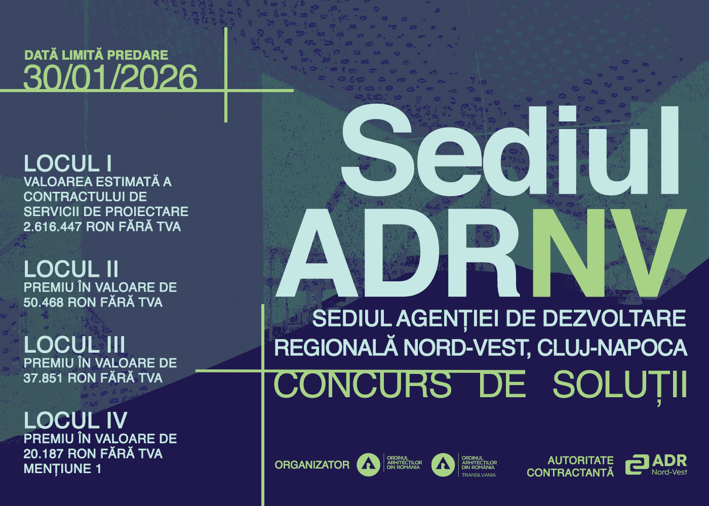 Ordinul Arhitecților din România (OAR), cu sprijinul Filialei Teritoriale Transilvania a OAR, alături de Autoritatea Contractantă – Agenția de Dezvoltare Regională Nord-Vest anunță oficial lansarea Concursului de Soluții „Sediul Agenției de Dezvoltare Regională Nord-Vest, Cluj-Napoca”.