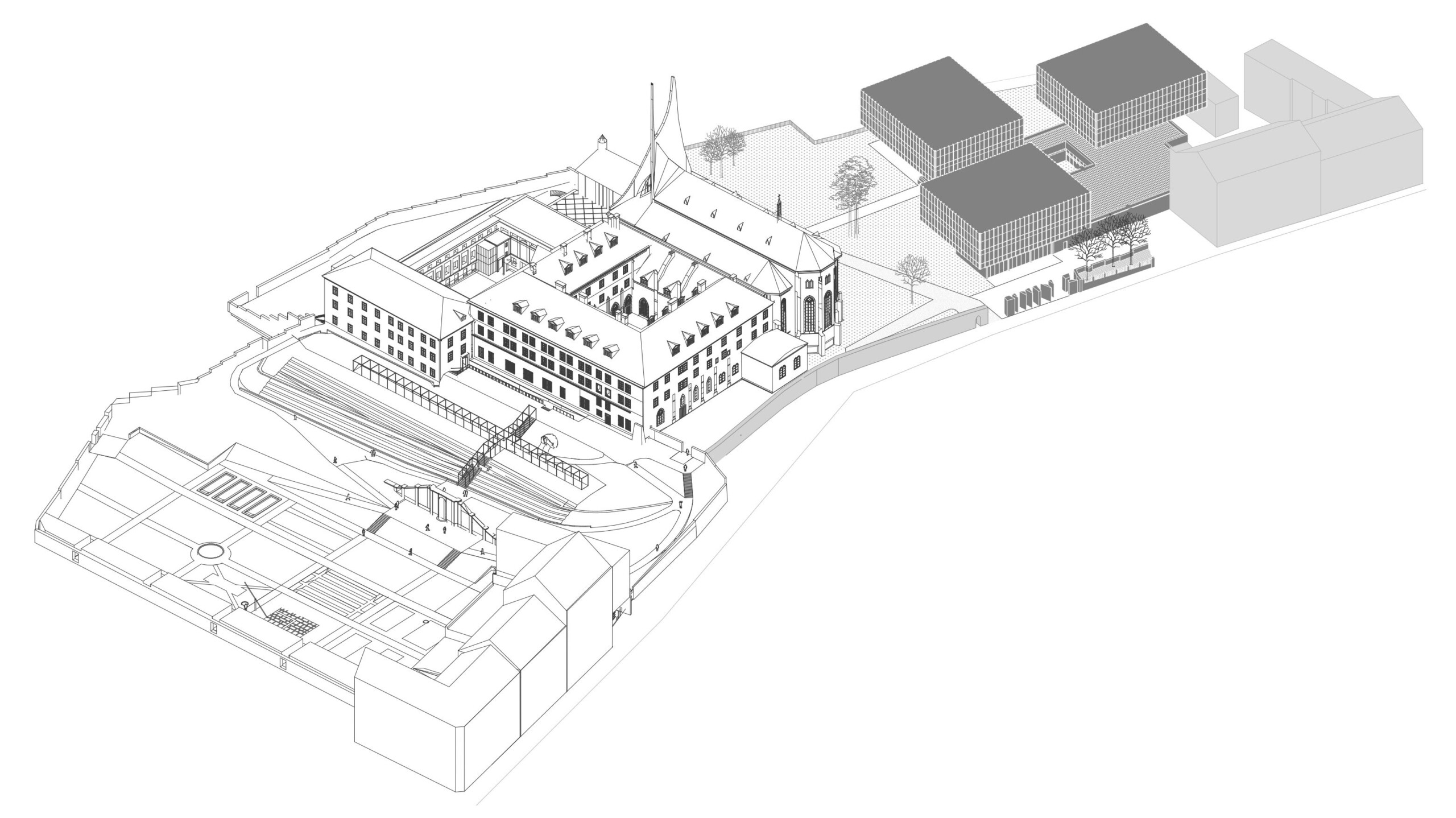 *Axonometria sitului. În centru, mânăstirea Emaus, în dreapta, fosta grădină a mânăstirii și centrul IPR