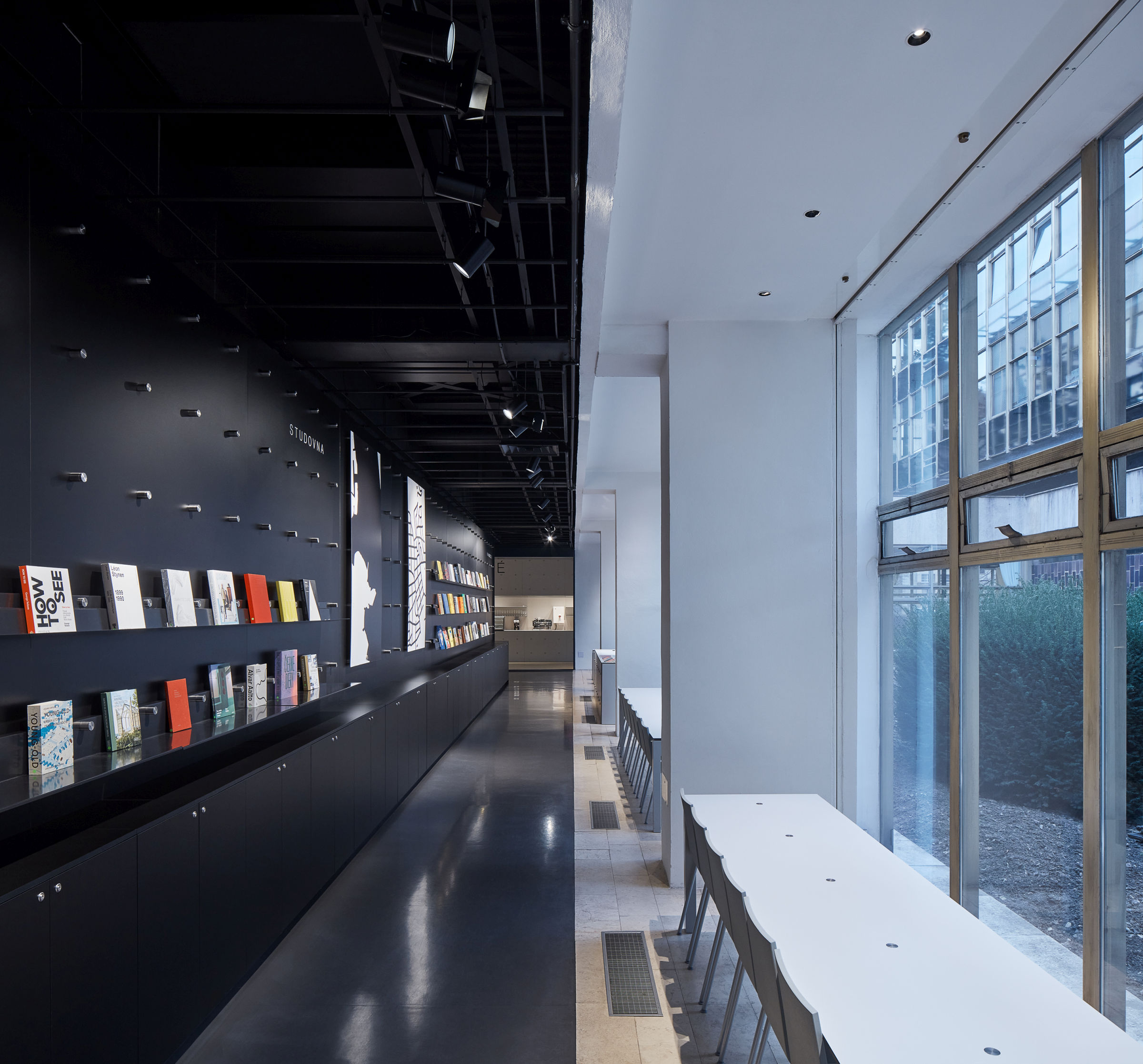 Încercăm să răspundem nevoilor prezente, dar și să dezvoltăm logica lui Prager. Unul dintre principalele elemente în acest sens este „grila de puncte”. Clădirea este obsesiv modulară și se conformează unor grile principale și secundare. Scările de acces au panouri mari prevăzute cu elemente rotunde de mari dimensiuni (punctele) spațiate uniform și fabricate din alamă. Noi le-am multiplicat, dar punctele noastre sunt realizate din oțel folosind tehnologia contemporană. Ele servesc în principal pentru expoziții și vizionări, pentru susținerea rafturilor din librărie etc. Se repetă apoi ca o serigrafie pe pereții vitrați. Punctele au devenit o parte esențială a noii identități vizuale a clădirii, vizibile atât în limbajul grafic, cât și în spațiul fizic. Le regăsești pe site-ul web, în fiecare produs tipărit, în fiecare piesă de mobilier etc.