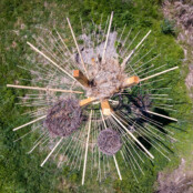 Lucrarea propune o experimentare a perspectivei anamorfice: dintr-un punct de observație privilegiat – o platformă de lemn amplasată la intrarea în poiană – compoziția se revelează ca o imagine coerentă, iar odată ce privitorul părăsește acel punct, percepția se modifică, distanțele și dimensiunile pieselor se transformă.