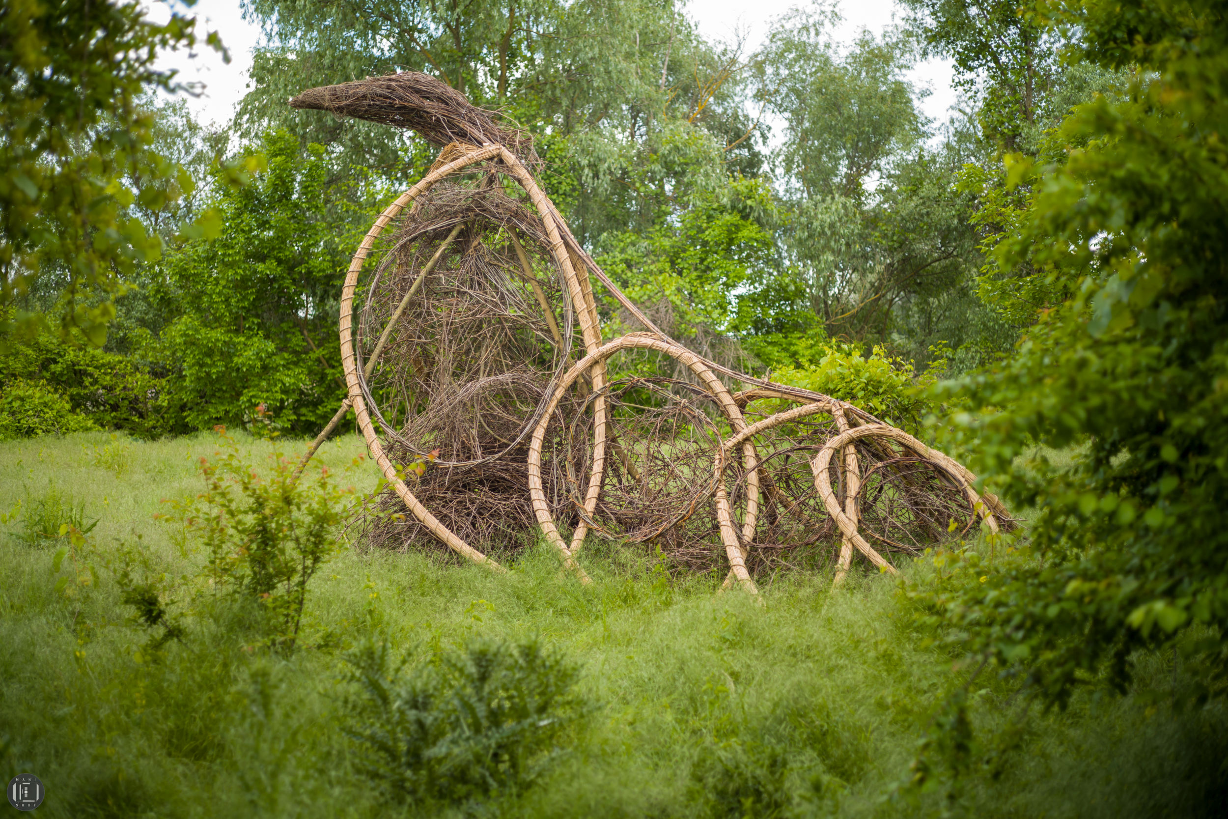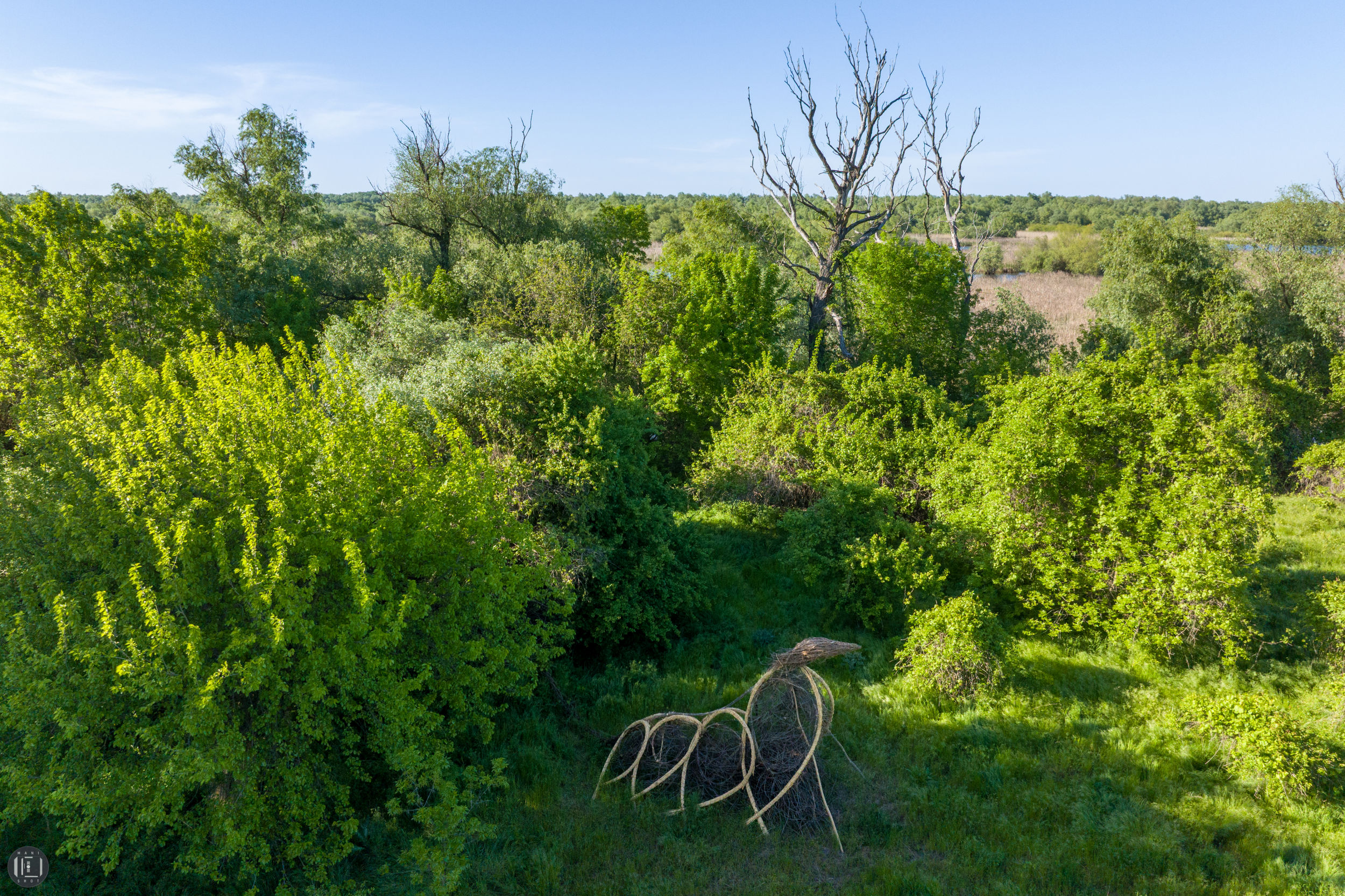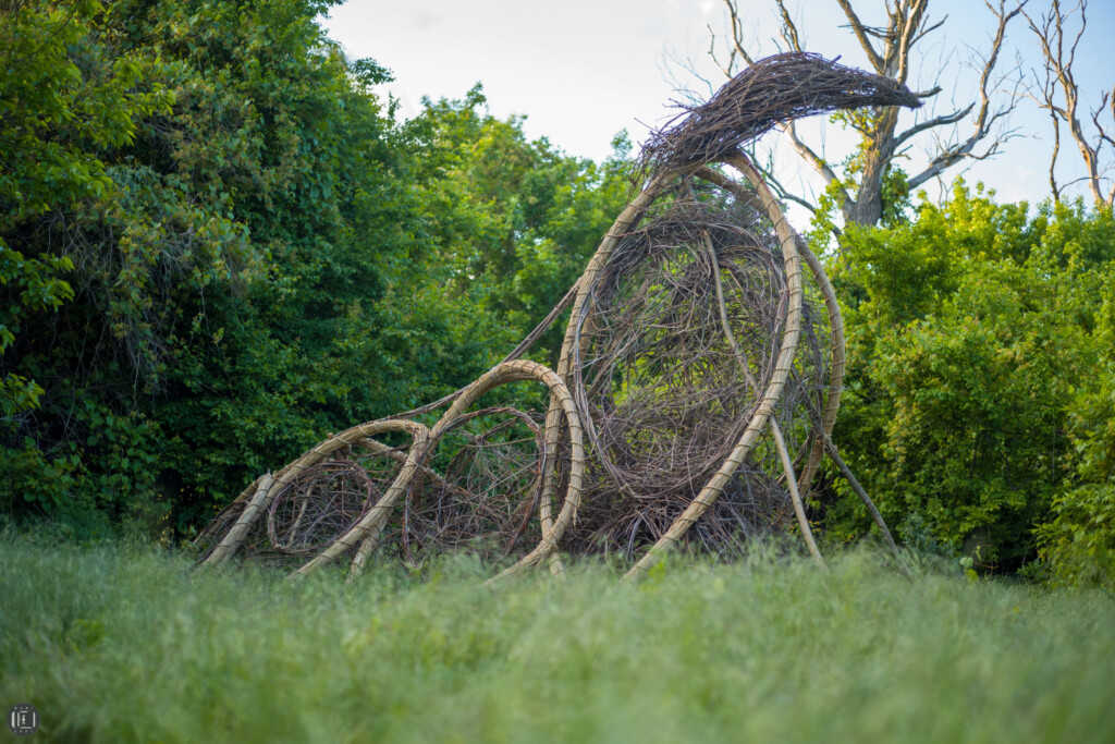 Instalația DRAGONFLY propune o reflecție poetică asupra relației dintre om și natură, inspirată de miturile și peisajele fluide ale Deltei Dunării. Creată din materiale indigene (stuf, salcie, viță de vie sălbatică și liane), structura evocă o creatură suspendată între apă și aer, o libelulă fantastică ce pare să prindă viață din respirația locului.