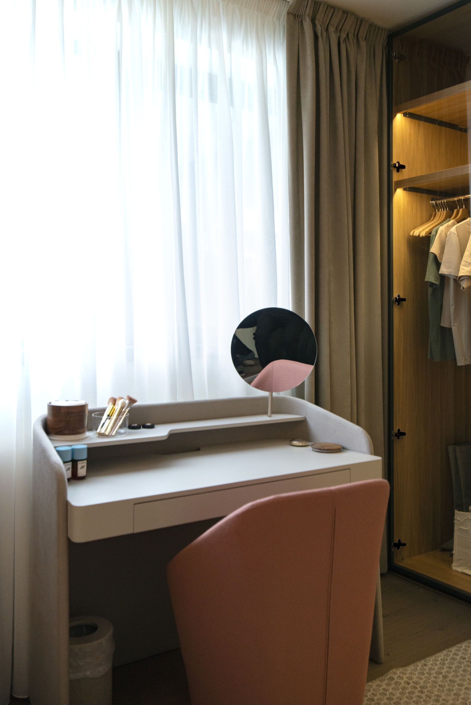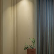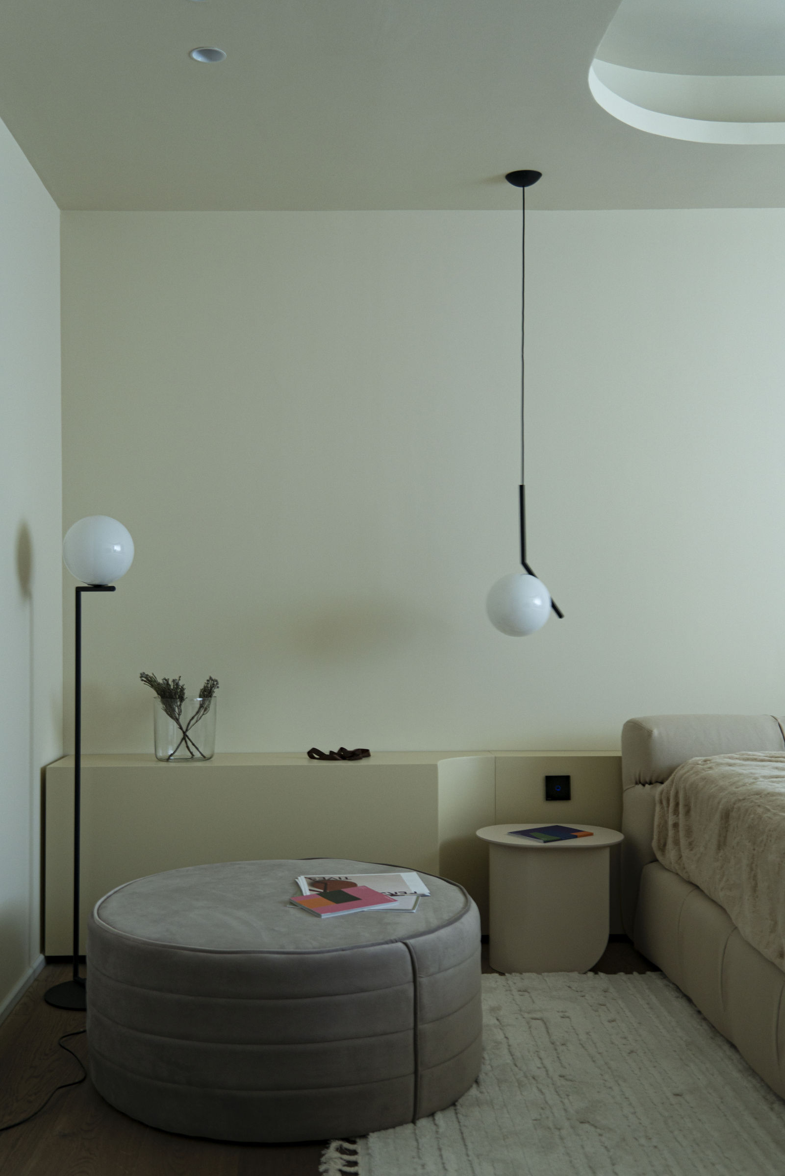 The assembly of sinuous surfaces, textiles and visually easy or transparent elements, is balanced through the use of ceramic in the table/floor lamps and of decorative bodies marking the commode area in the main space. The range of colours used works with neutral and natural tones to contribute to the desired atmosphere and also to allow the light to emphasize the volumes through subtle alternances in intensity and warmth.