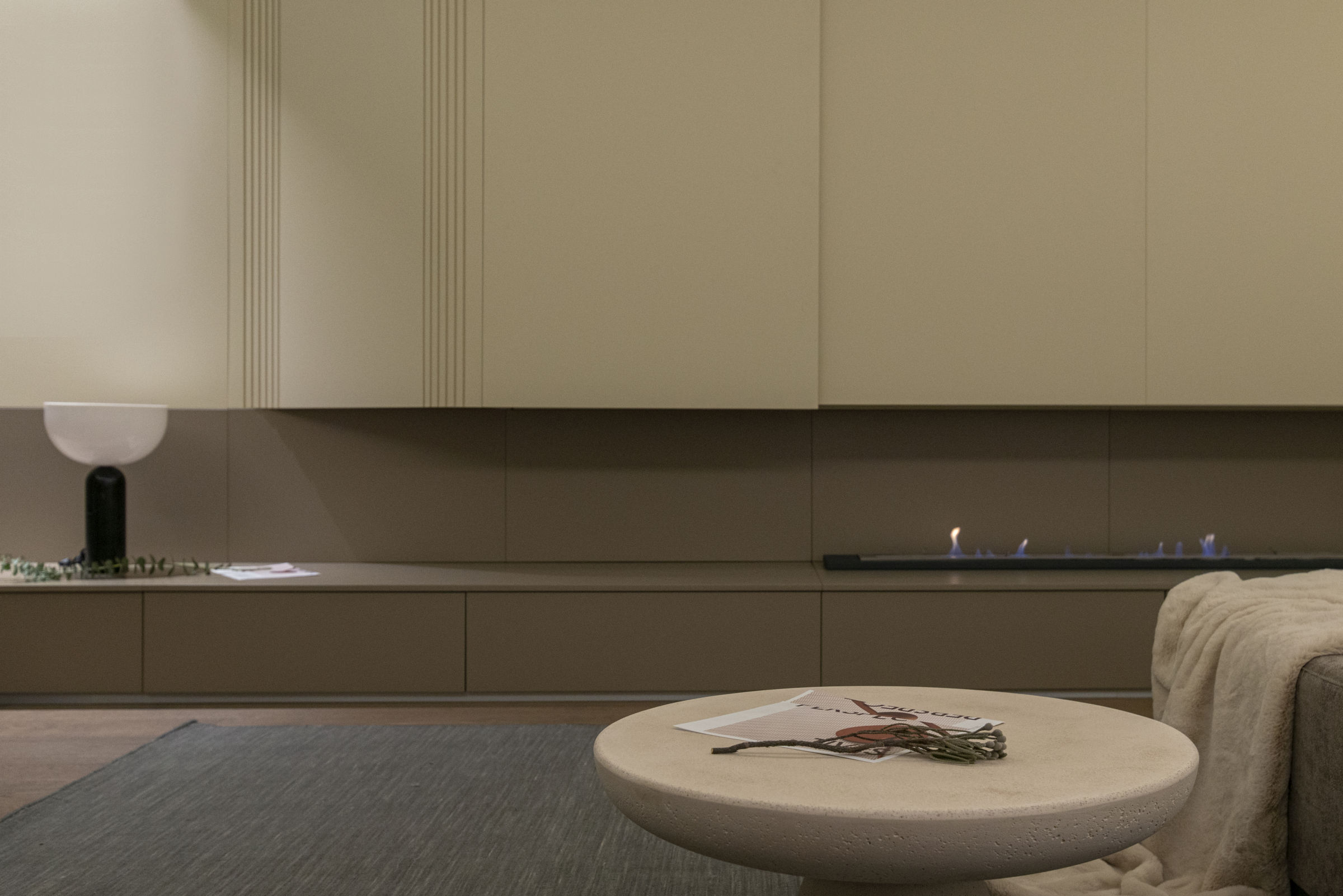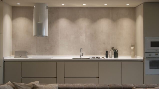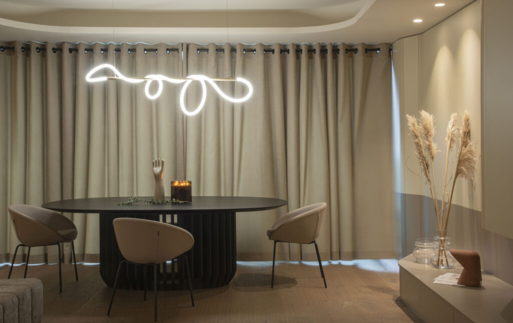 We have suggested the redefinition of the apartment’s limits, as a continuous and sinuous perimeter. This new backdrop plays many functional roles and is showcased through the use of several types of lighting. More importantly, it visually connects the various living spaces and areas, and the curved shapes define zones with a different character, starting from the access lobby, going through the kitchen, dining, lounge, and ending in the bedroom.