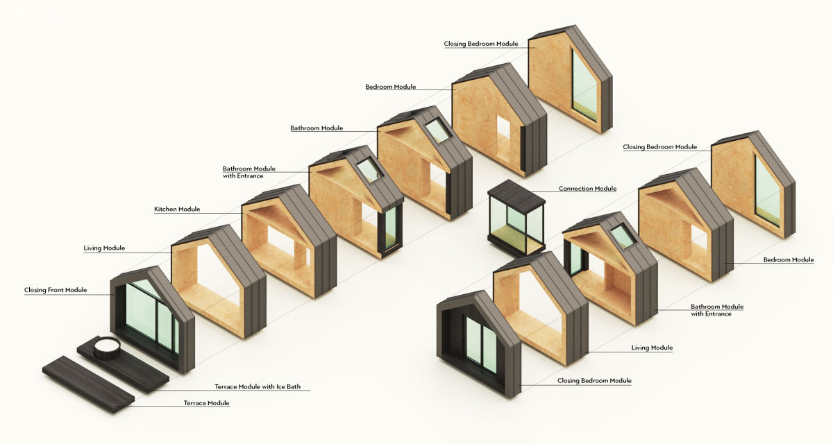 In this case, modular truly means “made of modules” — standardized, identical, and interchangeable units. “Cătun (“Hamlet”) system allows modules to be added or removed (thus increasing or reducing the usable area) without damaging the structural elements.