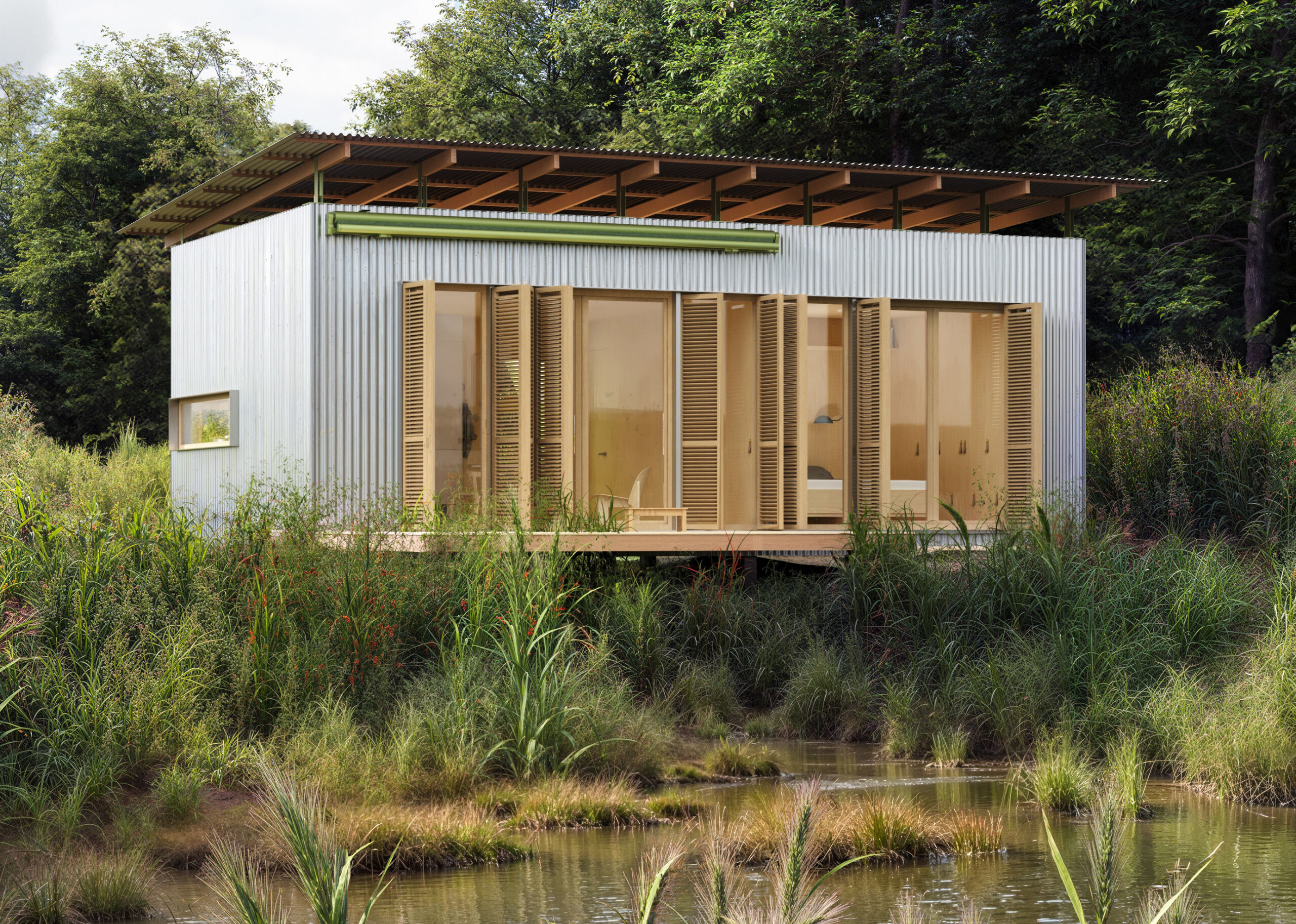 In this modular housing experiment, wood takes center stage, supported and complemented by a series of spatial and architectural details in metal.