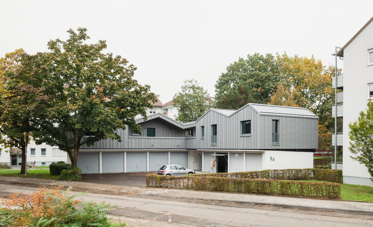 In the Rintheim district of Karlsruhe, three ordinary post-war garage rows have become the unlikely support for twelve new homes. The project does not erase the garages — they remain in operation — but builds upon them, literally and conceptually, as a model of sustainable densification.