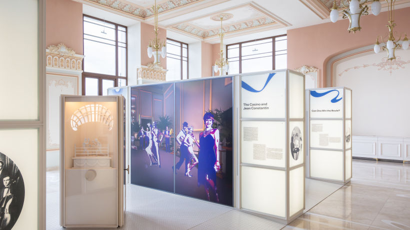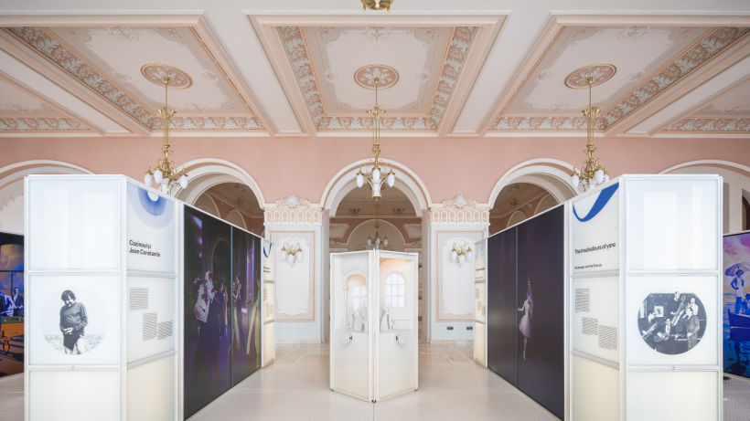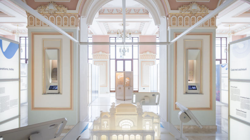 First of all, the installations in the exhibition respect and enhance the monument-building, the casino architecture being treated as an exhibit in itself. The configuration and placement of the exhibition furniture and lighting, as well as the visitor routes, emphasize the spatial logic of the building, privileging the best perspectives on the iconic architectural elements (shell windows, columns, openings between spaces, monumental staircases, stained glass windows, etc.).