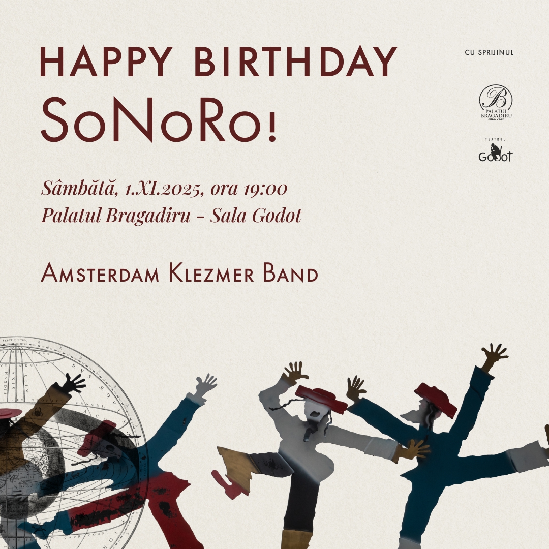 Concertul HAPPY BIRTHDAY SoNoRo! este programat sâmbătă, 1 noiembrie 2025, de la ora 19:00, la Palatul Bragadiru – Sala Godot și va fi urmat de o petrecere aniversară. Pe scena Palatului Bragadiru se va afla grupul Amsterdam Klezmer Band, un fenomen muzical la nivel internațional, cu o carieră care depășeste 25 de ani.