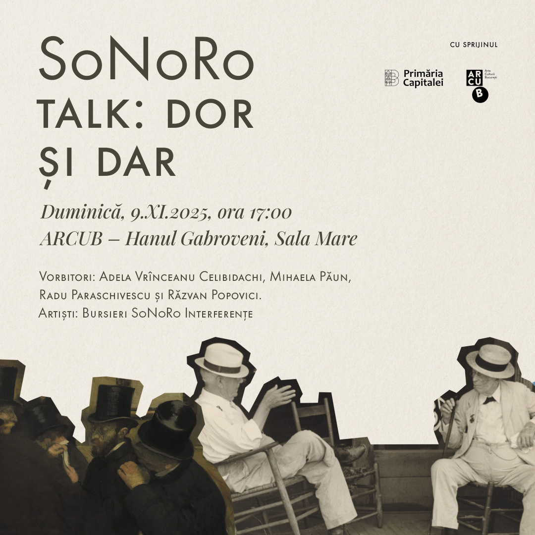 Inclusă deja de trei ani în programul festivalului, SoNoRo Talk favorizează discuții fertile despre muzica clasică și rolul pe care îl are în viețile noastre. În acest an, publicul este invitat duminică, 9 noiembrie 2025, de la ora 17:00, la SoNoRo Talk: Dor și Dar, care va avea loc la ARCUB – Hanul Gabroveni, Sala Mare. Accesul este liber, în baza unei rezervări pe Eventbook.ro. Discuția se va concentra pe intersecțiile care se creează între conceptele dor și dar, dorul fiind un sentiment profund melancolic și care a adus de-a lungul timpului multă inspirație în viața artiștilor și s-a transformat într-un dar plin de sevă creatoare.