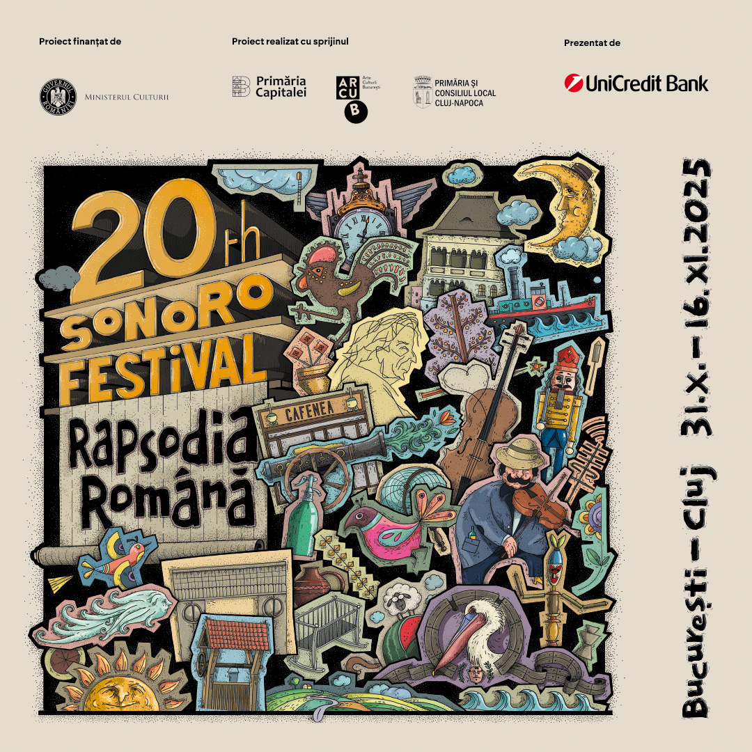 Festivalul SoNoRo începe vineri, 31 octombrie 2025, cu un concert care deschide ediția nr. 20, intitulată „Rapsodia Română”, în Sufrageria Regală de la Muzeul Național de Artă al României. Sâmbătă, 1 noiembrie 2025, la Palatul Bragadiru – Sala Godot, este programat concertul Happy Birthday SoNoRo! cu efervescentul grup Amsterdam Klezmer Band – un fenomen muzical la nivel internațional.
