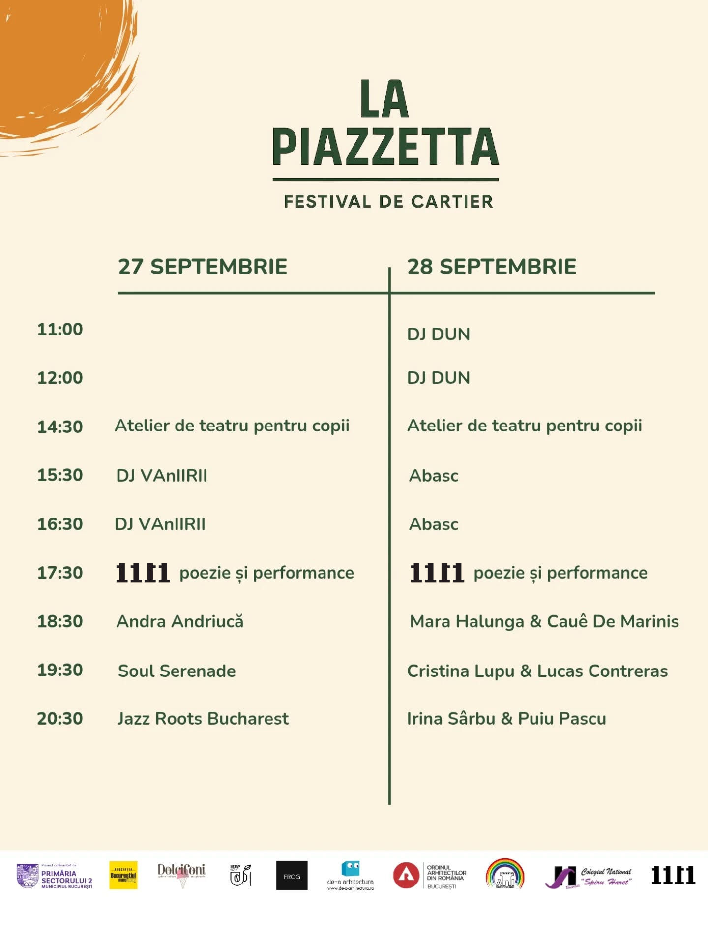 La Piazzetta – Festival de cartier în Piața Italiană este finanțat de Primăria Sectorului 2, prin contractul de finanțare nerambursabilă nr. 122796/19.08.2025, și se realizează cu sprijinul partenerilor locali: Liceul Spiru Haret, De-A Arhitectura, OARB – Ordinul Arhitecților din România, Filiala București, Dolci Coni, Burgerz, Heavy Rotation și Frog.