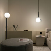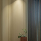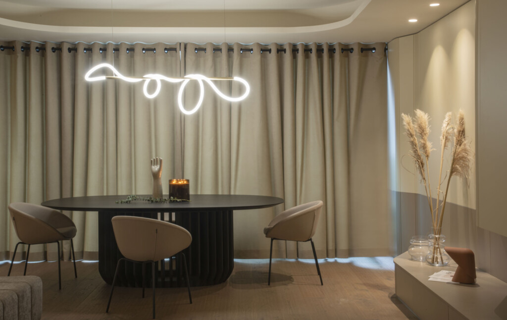 Ansamblul de suprafeţe sinuoase, textile şi elemente uşoare vizual sau transparente este echilibrat prin folosirea ceramicii pentru lămpi de masă/pardoseală şi a unor corpuri decorative care punctează zona de comodă din spaţiul principal. Gama de culori folosită lucrează cu tonuri neutre şi naturale pentru a contribui la atmosfera dorită, dar şi pentru a lăsa loc luminii să pună în valoare volumele prin alternanţe subtile de intensitate şi căldură.