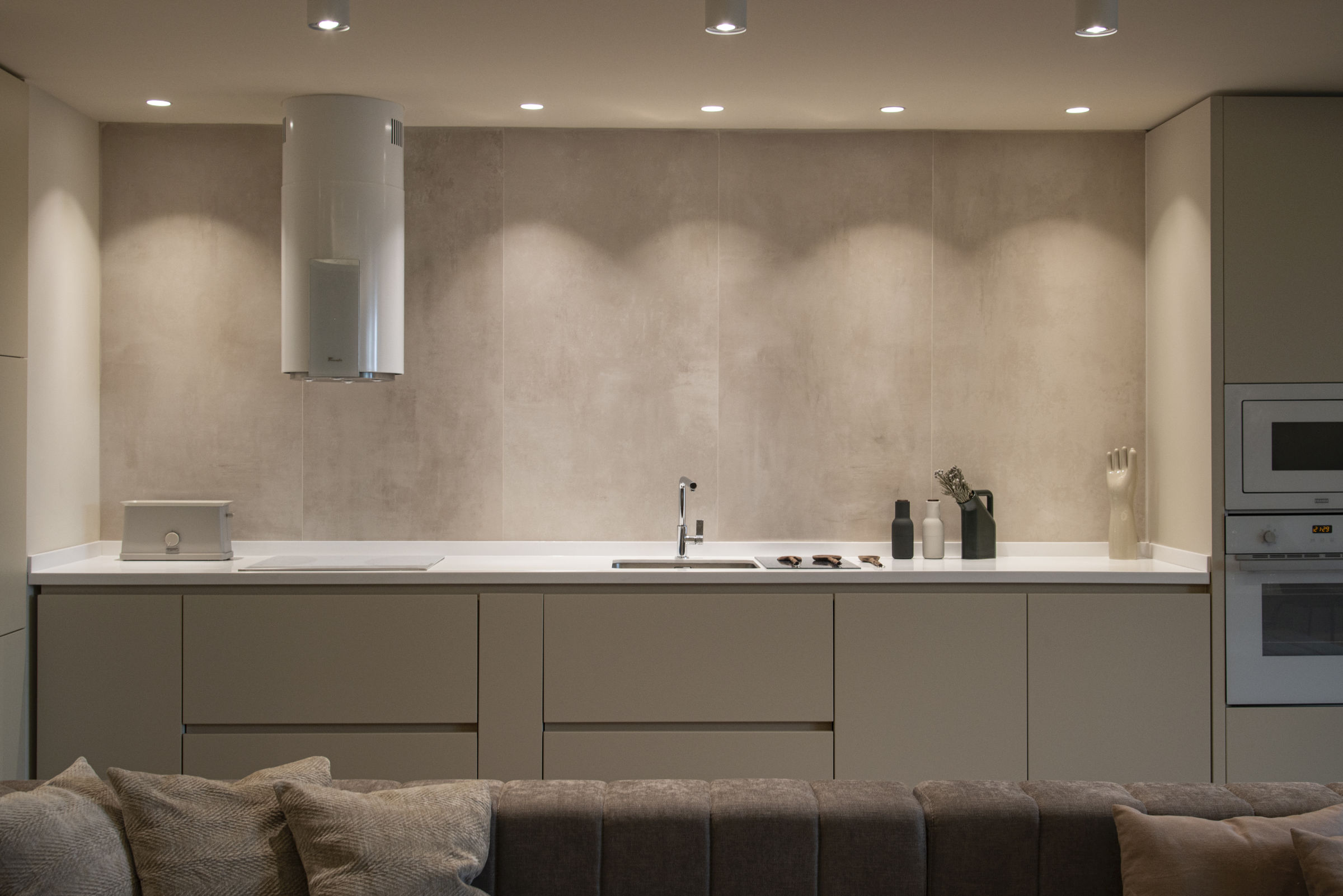 Ansamblul de suprafeţe sinuoase, textile şi elemente uşoare vizual sau transparente este echilibrat prin folosirea ceramicii pentru lămpi de masă/pardoseală şi a unor corpuri decorative care punctează zona de comodă din spaţiul principal. Gama de culori folosită lucrează cu tonuri neutre şi naturale pentru a contribui la atmosfera dorită, dar şi pentru a lăsa loc luminii să pună în valoare volumele prin alternanţe subtile de intensitate şi căldură.