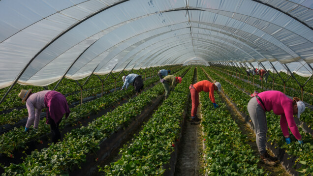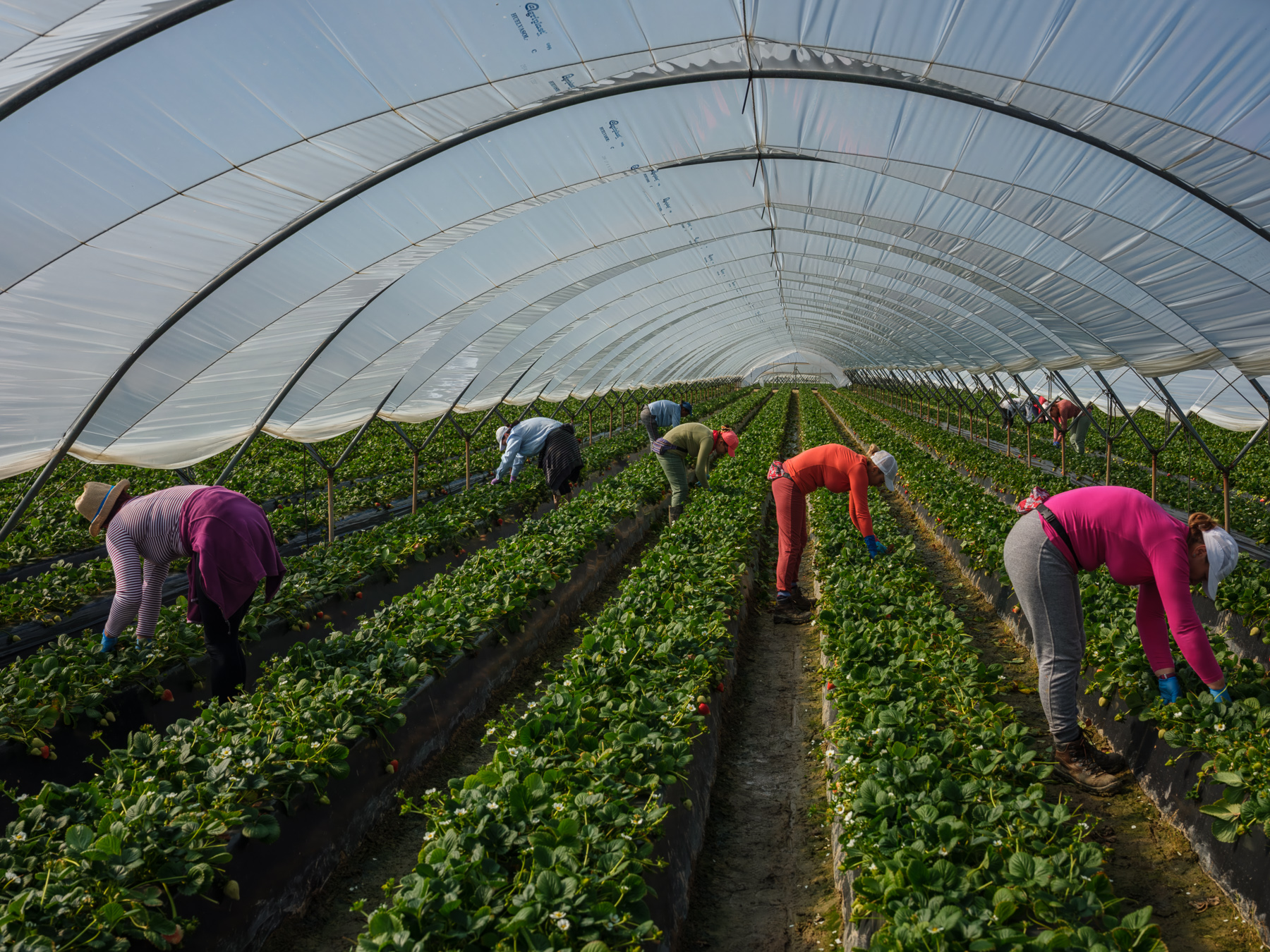 001 Muncitoarele românce culeg căpșuni într-un solariu din Palos de la Frontera, Spania. Niciuna dintre femei nu își va îndrepta spatele înainte ca lăzile de zece kilograme să fie umplute cu căpșuni. Abia atunci se ridică și duc lada la camion, unde șeful de câmp o încarcă pe paleți. Femeile își îndreaptă spatele doar de 15 ori în timpul unei zile obișnuite de muncă; în medie, o muncitoare culege 150 de kilograme de căpșuni pe zi. 26 februarie 2020. Foto: Cosmin Bumbuț