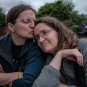 002 Ella, 40 de ani, și Crina, 38, s-au mutat din România în Anglia în 2018 deoarece erau discriminate și relația lor nu era recunoscută – România nu permite căsătoriile între persoane de același sex. De când au venit în Anglia, s-au căsătorit, au cumpărat o casă în rate și au început să o renoveze. Fotografia a fost făcută în curtea casei lor din Tamworth, Anglia, 3 august 2021. Foto: Cosmin Bumbuț