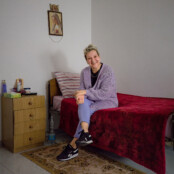 003 Eugenia, 54 de ani, îngrijește persoane în vârstă în Italia. Fotografia a fost făcută în casa unei bătrâne de 94 de ani din Leverano, provincia Lecce, în camera în care Eugenia este cazată. Românca a plecat din țară ca să scape dintr-o relație abuzivă — se temea că soțul ei o va ucide. Italia, 3 mai 2022. Foto: Cosmin Bumbuț