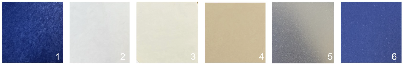 *1- hârtie de mătase albastră; 2, 3, 4 – foi de 80 g cu trei culori diferite; 5- calc; 6-carton albastru