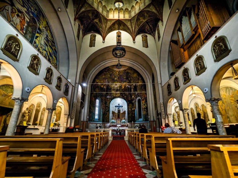 Biserica are o lungime de 24 de metri şi o lăţime de 17 metri, iar clădirea a fost ridicată pe un plan în cruce greacă, cu o cupolă centrală și trei nave în forma de bazilică. Pictura altarului înfăţişează un trunchi de arbore cu multe ramuri, pe care sunt figurate biserici din Italia. Interiorul are picturi, vitralii și mozaicuri, iar exteriorul este din cărămidă. Are un turn cu trei clopote și lângă ea se află o casă parohială cu o curte. Construcţia a fost sfinţită de Arhiepiscopul Raymond Netzhammer.