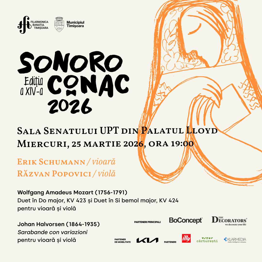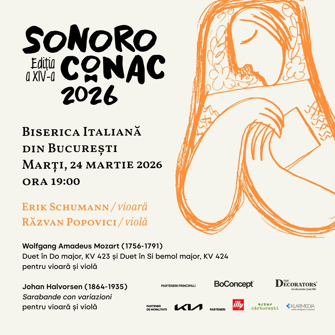 A doua parte a turneul SoNoRo Conac, aflat la ediția a XIV-a, continuă cu două concrete programate în premieră la Biserica Italiană din București (marți, 24 martie 2026, ora 19:00) și la Palatul Lloyd din Timișoara (miercuri, 25 martie 2026, ora 19:00). Accesul la concertul din București este liber, în baza unei rezervări pe site-ul https://conac.sonoro.org/. La concertul din Timișoara, organizat în parteneriat cu Filarmonica Banatul Timișoara, accesul se face în baza biletelor care se pot achiziționa de pe site-ul entertix.ro.