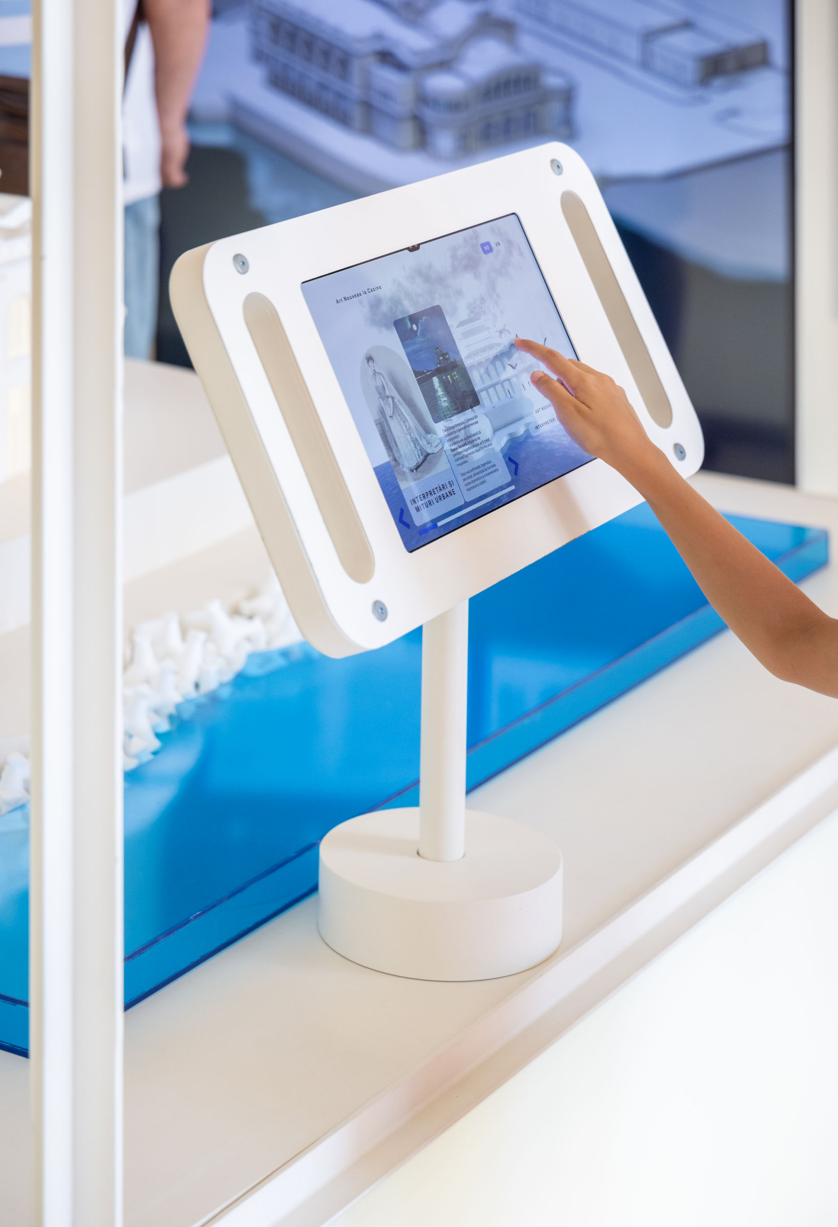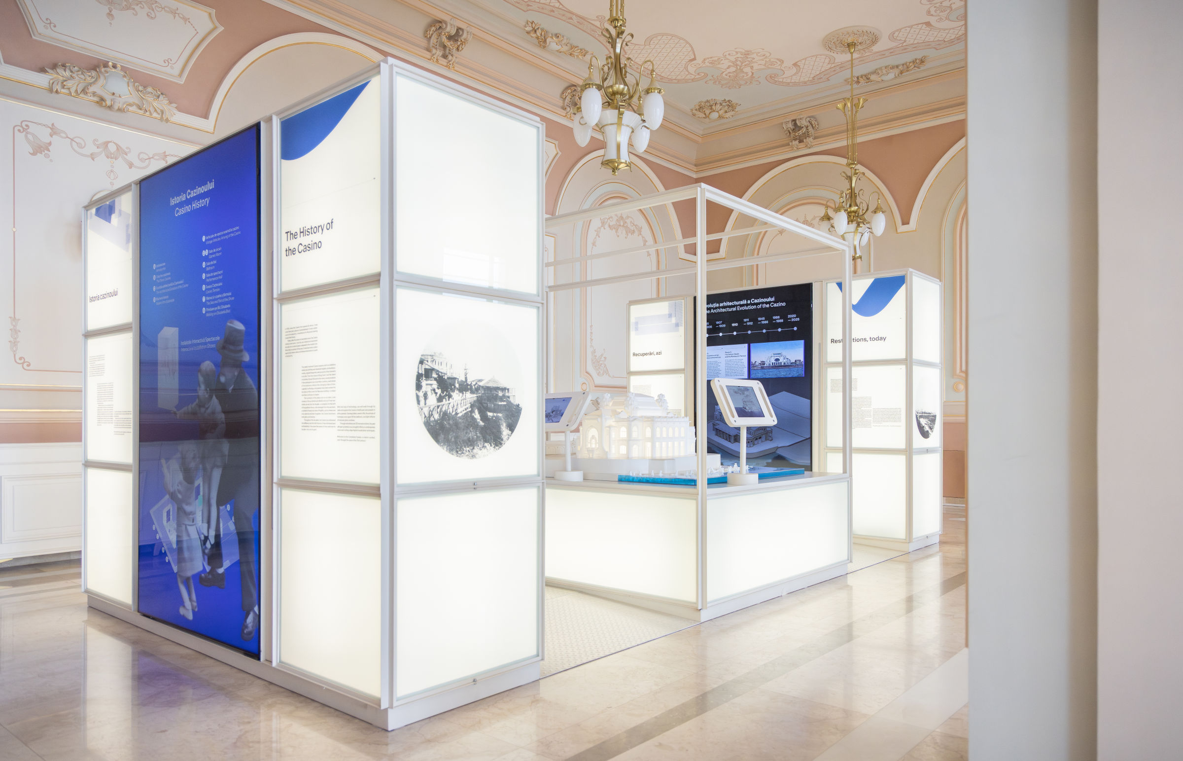În al doilea rând, intervenția într-un context foarte ornamentat și decorat impune o ocupare fizică minimală a spațiului și o estetică minimalistă a sistemelor expoziționale, conținutul informațional fiind oferit în formate extinse multimedia (augmented reality, virtual reality, filme, animații, vizualizări 3D, experiențe imersive secvențiale, navigare în conținut digital etc.). Tot pentru o ocupare minimală a spațiului, biletele scrise de deținuții politic care au lucrat la reconstrucția cazinoului în anii ’50, găsite odată cu decopertarea zidăriei, sunt expuse în firide existente în volumul coloanelor de la parter, în loc de vitrine dedicate.